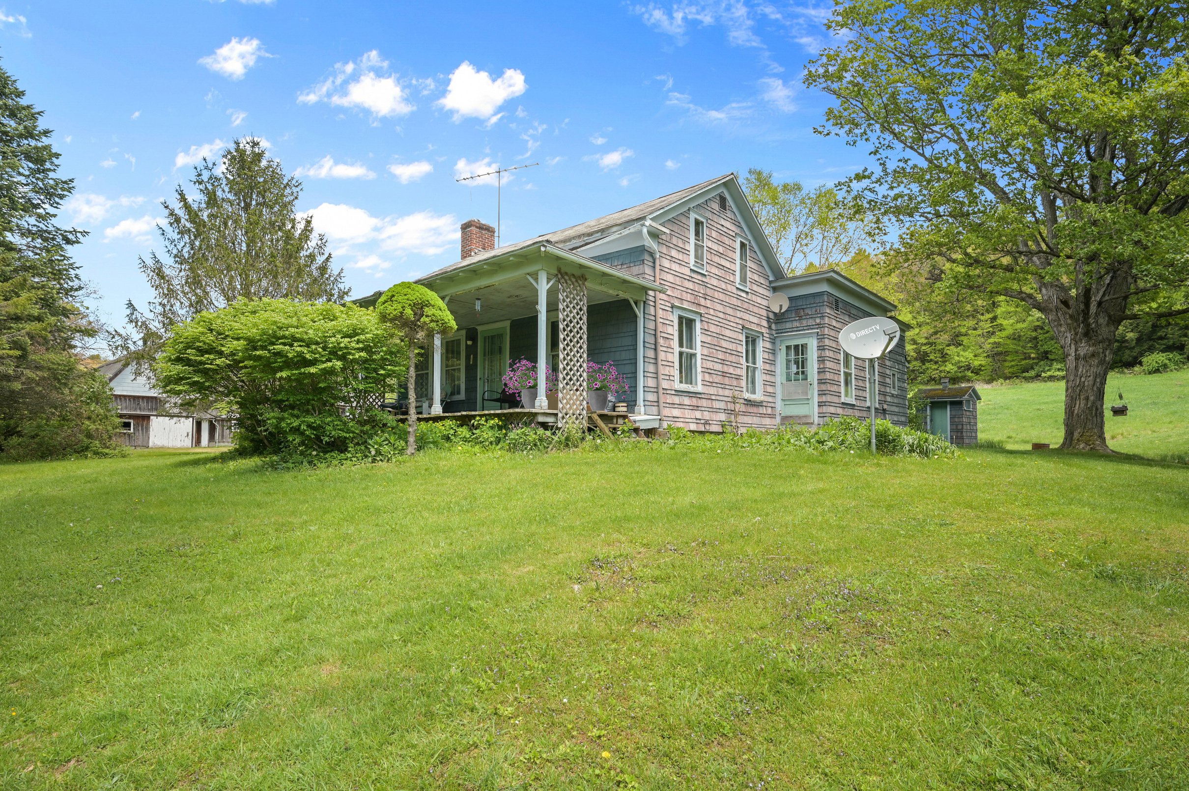 Step inside to discover the farmhouse's interior, boasting three cozy bedrooms, a large eat-in kitchen with a lovely antique dual-fuel cooking stove, a formal dining room, and a fireplace in the living room.